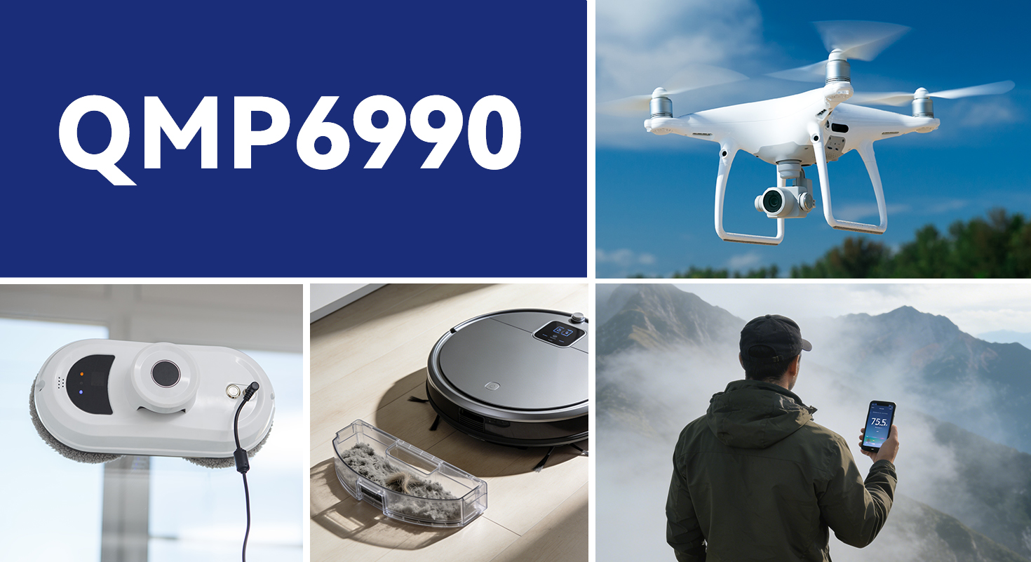 The QMP6990 is a digital barometric pressure sensor specifically designed for applications requiring high-precision pressure measurement, such as aircraft altitude control and portable navigation devices. It measures 2.0 × 2.0 × 0.95 mm³ in size.